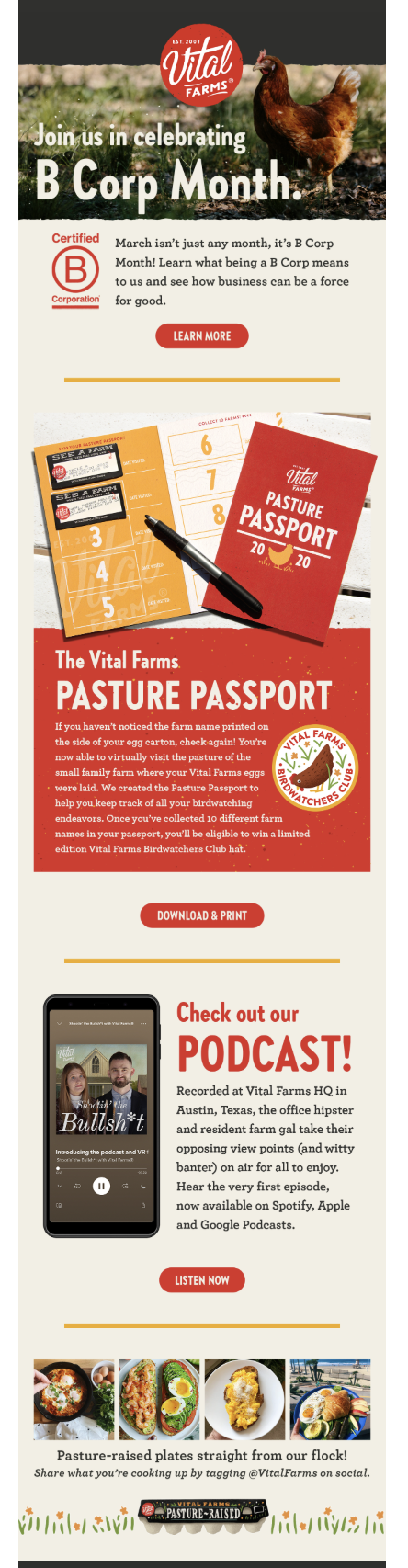 As part of a nimble creative team of two at Vital Farms, my role as Content Lead encompassed far more than copywriting. On top of copy for email, social, website, blog, consumer responses, and campaigns, I also led and managed social and email strategy and scheduling. I was the driving force behind creative direction and concepting, while also acting as our in-house photographer and overflow designer.